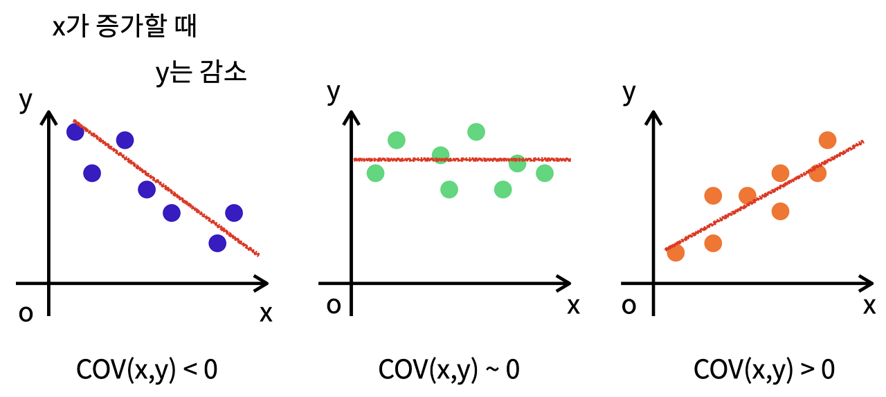 - 공분산이란, 1개의 변수 값이 변화할 때 다른 변수가 어떠한 연관성을 나타내며 변하는지를 측정하는 것