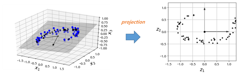 - 일반적으로 실제 데이터 셋은 모든 데이터의 특성, 즉 차원이 고르게 분포되어 있지 않다. 필기체 숫자 데이터셋인 MNIST로 예를 들면 각 어떤 특성은 거의 변화가 없고, 또 어떤 특성을 다른 특성들과 서로 연관되어 있다.