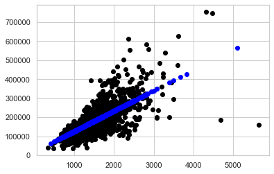 ## test 데이터에 대한 예측을 파란색 점으로 나타내 보겠습니다.