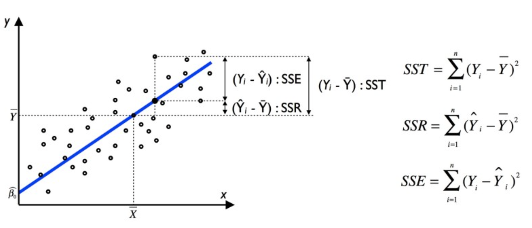 - 잔차 제곱합(SSE) : 실제치와 추정치의 차이를 제곱한 값들의 합, 추정치로도 설명할 수 없는 차이를 말합니다.