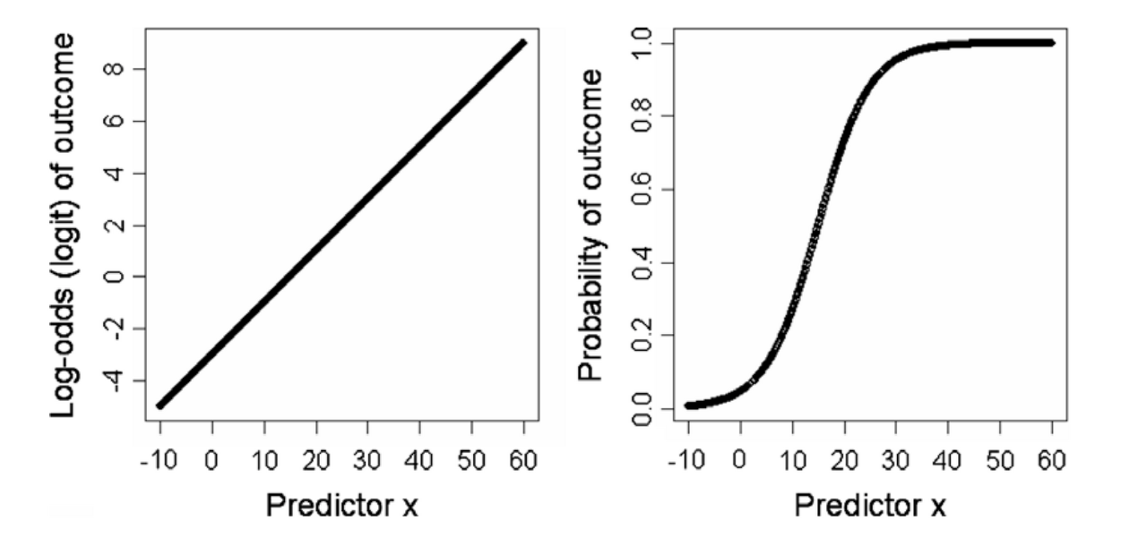 - 왼쪽과 같이 선형회귀일 때는 Y의 범위는 −∞ ~ Y과 0~1의 범위 값을 갖는 로지스틱의 경우에는 로짓변환을 통해 오른쪽 그림과 같이 곡선형으로 변환합니다.