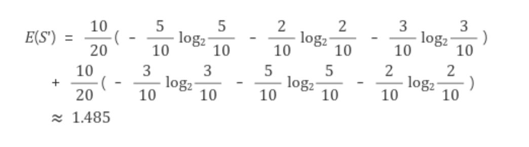 - G(S) = 1.558 - 1.485 = 0.07정도 엔트로피 감소, 즉 정보 획득량이 0.07이며 분할한 것이 더낫다고 볼 수 있습니다.