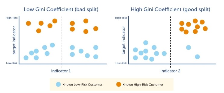 우측 그림에서의 지니계수는 1 - [ (0/10)^2 + (9/11)^2 ] = 0.33