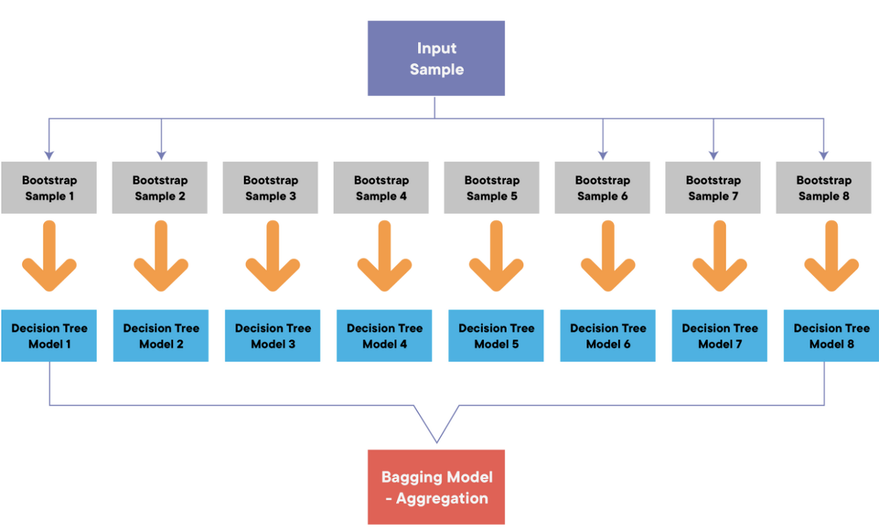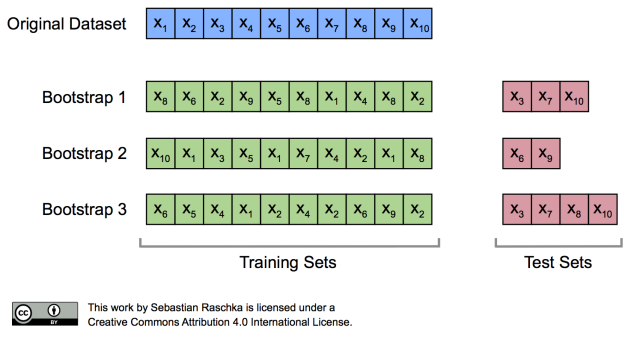 - 앙상블을 방법론 적으로 살펴보면, 모델을 여러개 만들어 합치는 것입니다. 이 때 모델을 여러개 만들기 위해 원본 데이터에서 여러개의 데이터 셋트를 복원 추출하여 학습을 진행하는데 이 때 복원 추출하여 만들어지는 데이터 세트를 부트스트랩세트라고 하며 이 과정을 부트스트랩 샘플링이라 합니다.