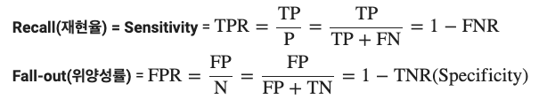 위양성률( Fall- out ) = FPR (False Positive Rate)*