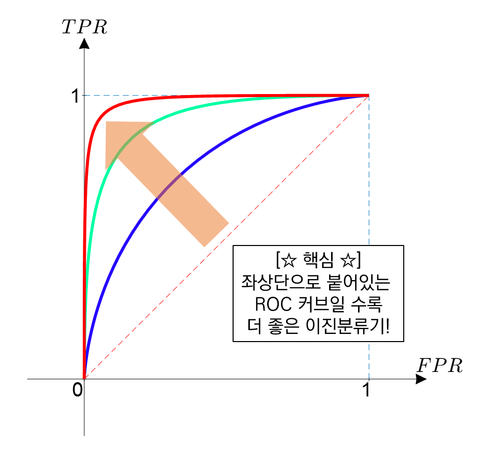 - 재현율은 최대화하고, 위양성률은 최소화 하는 임계값이 최적의 값입니다.