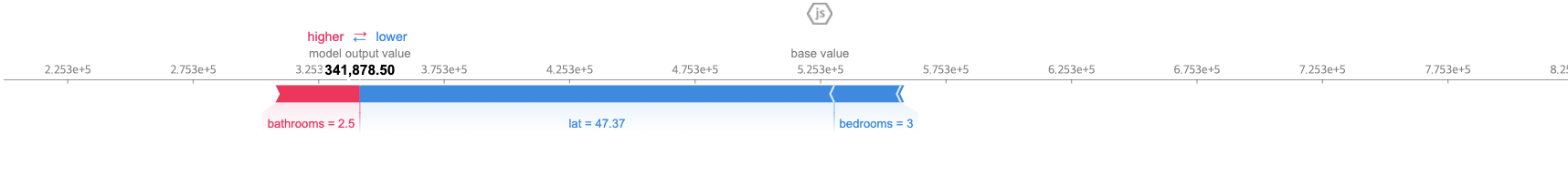 위의 코드와 아래 결과 그림을 보면, 해당 데이터는 가격을 예측하는 것이며 341,878.50원으로 예측하며 이 때 영향을 주는 특성을 살펴볼 수 있습니다.