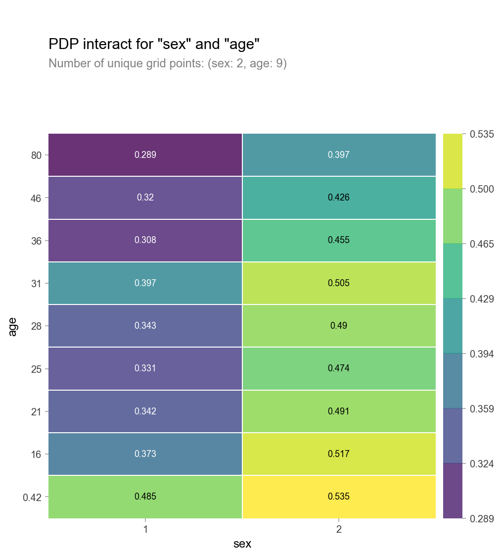 해당데이터는 타이타닉 데이터이며, 위의 그림은 해석하자면, sex=2 즉, 여자면서 나이가 어릴 수록 생존률이 높다고 해석할 수 있습니다.