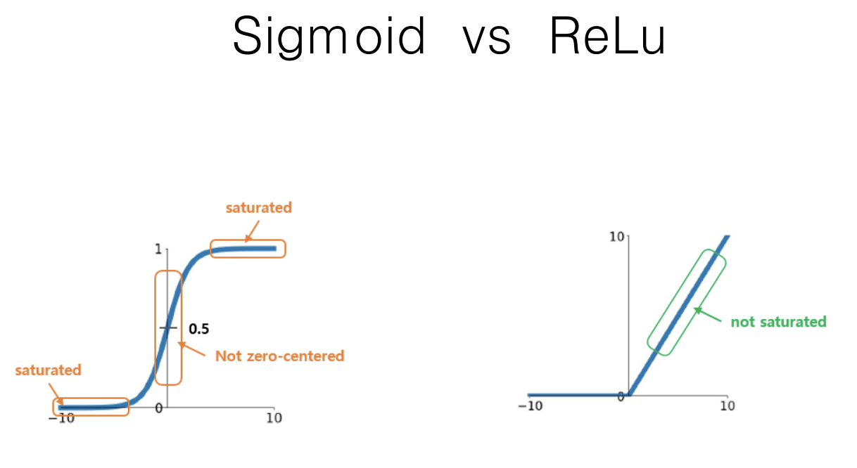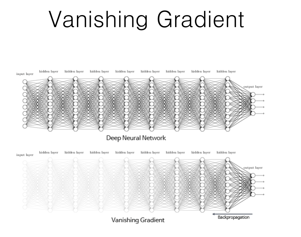 은닉층이 깊어질 수록, 미분되어지는 과정에서 너무나 작게되어 학습이 제대로 이루어지지 않는 다는 것입니다. 그래서 해결방법으로 나온 것이 다른 활성함수를 사용하자는 것이였습니다. 그래서 Relu라는 활성함수를 사용하게 되었습니다.