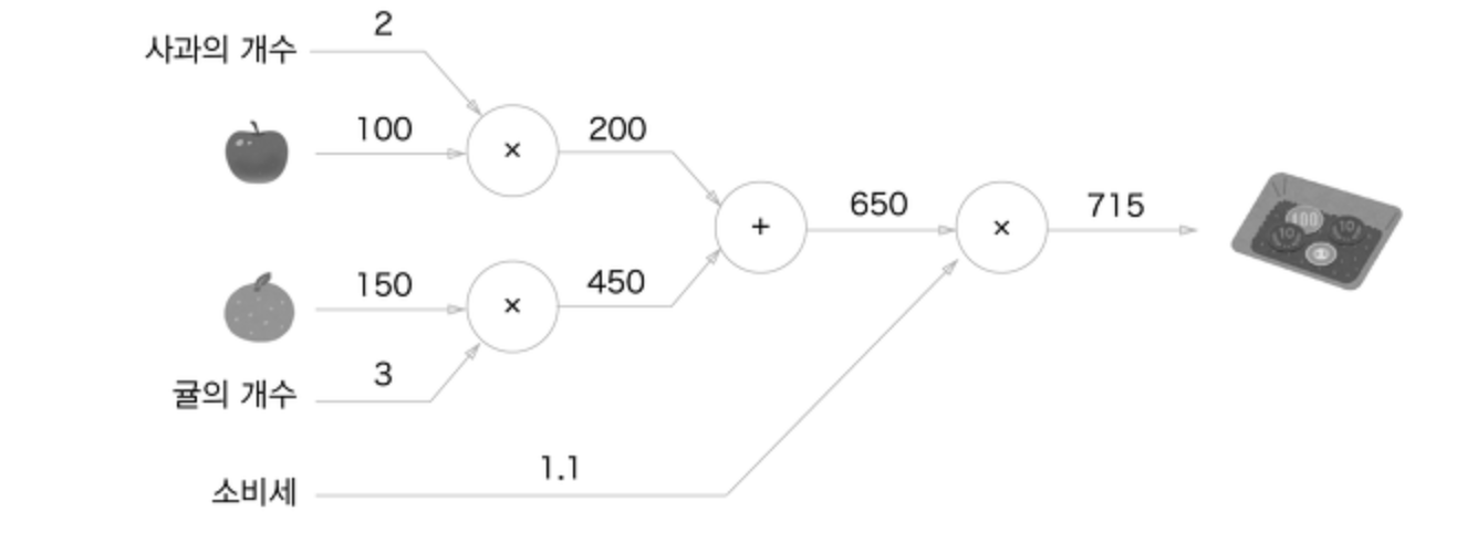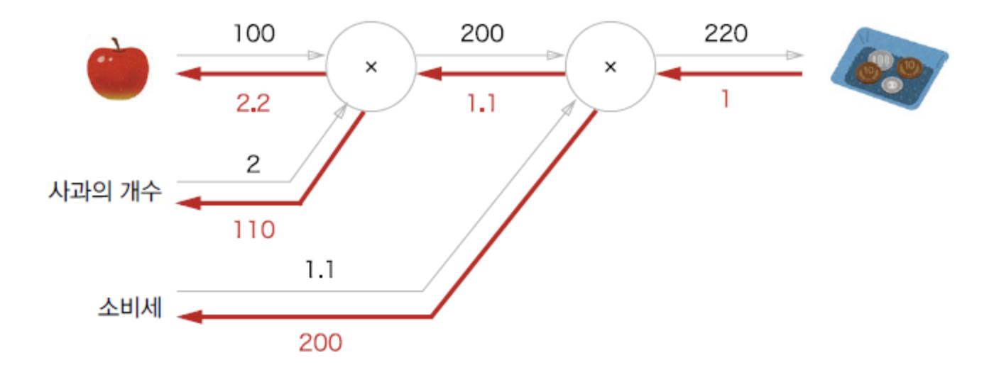 이 예에서 역전파를 살펴보자면 맨 윗줄에서 오른쪽에서 인쪽으로 1 -> 1.1 -> 2.2 순으로 미분 값을 전달합니다. 즉 사과가 1원 오르면 최종 금액은 2.2원 오른다는 의미입니다. 사과에 대해서만 구했지만 소비세나, 개수도 미분 값을 (200, 110)임을 알 수 있습니다.