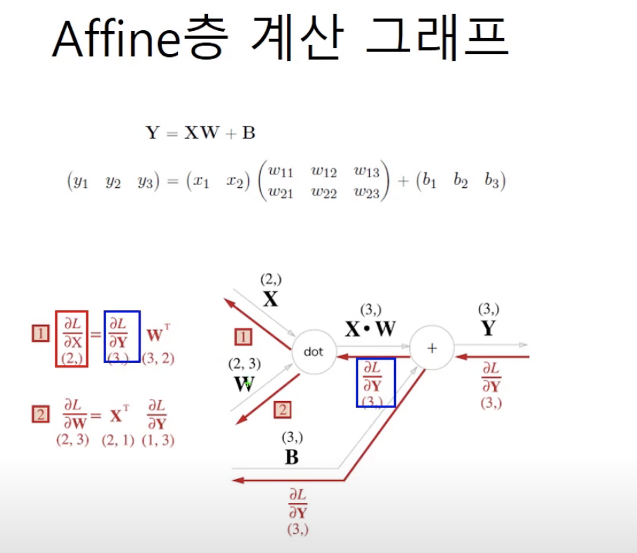 - Affine에서 역전파 과정에서 곱셈노드의 경우, 각 곱셈으로 들어온 노드의 순수 값을 알기 위해서 다른 노드로 나눈다.