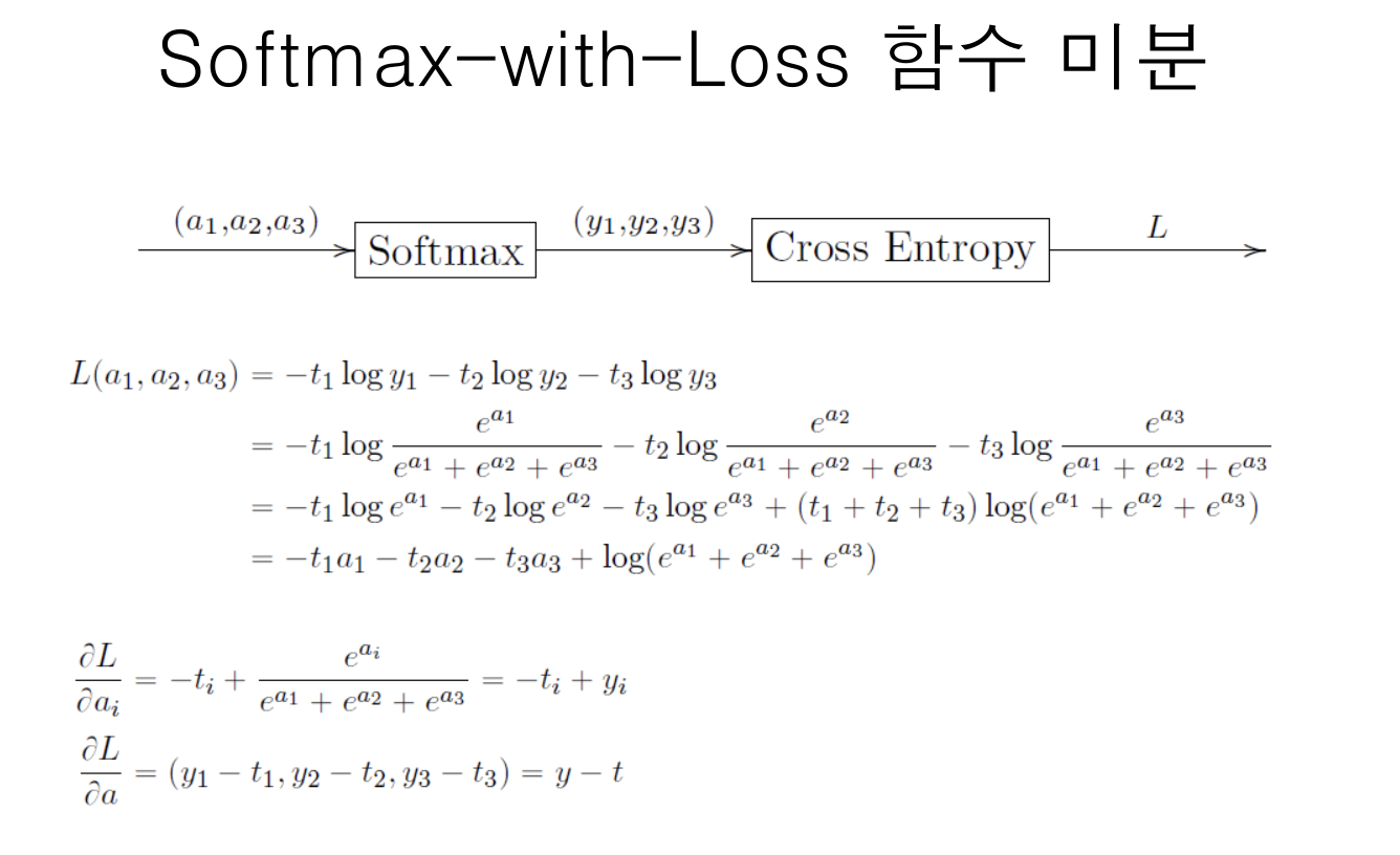 소프트맥스층과 크로스엔트로피층은 두개를 합성하여, 도합수를 구하는게 간단하다 보통은 각각의 도함수가 덜 복잡하지만, 합성한 후의 도합수가 간단. 그래서 두층을 엮어서 역전파를 생각 해야합니다. 이 두개의 층을 softmax-with-loss층이라고 부를 것입니다.