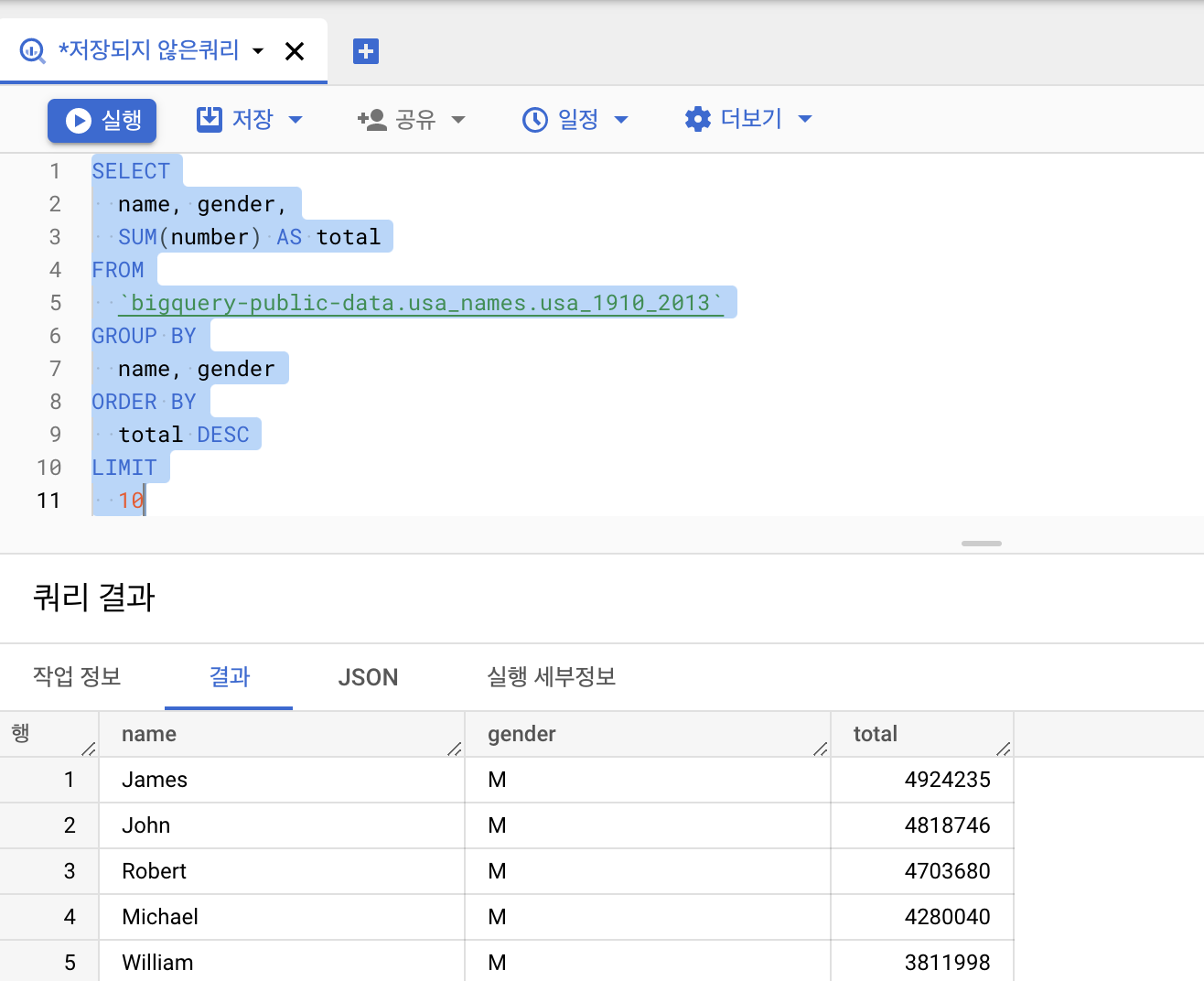 빅쿼리의 UI를 살펴보면 아래처럼 Query문을 작성하는부분이 있습니다.